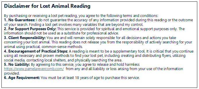 Can you guarantee my animal’s behavior will change after your reading? Unfortunately, no. They have the choice to change their behavior… or not. Usually the reason for the behavior will be made clear during the reading. Sometimes it’s simple, like changing the brand of cat litter. Other reasons are more complex and the solution may require both you and your animal making changes. The reading offers you some insight – from the animal - into WHY s/he is behaving in a particular way. In some cases, you and your animal may need to work with an animal behaviorist or trainer. However, if the animal draws attention to specific areas of pain or discomfort in his/her body, I will always recommend you check first with your veterinarian.